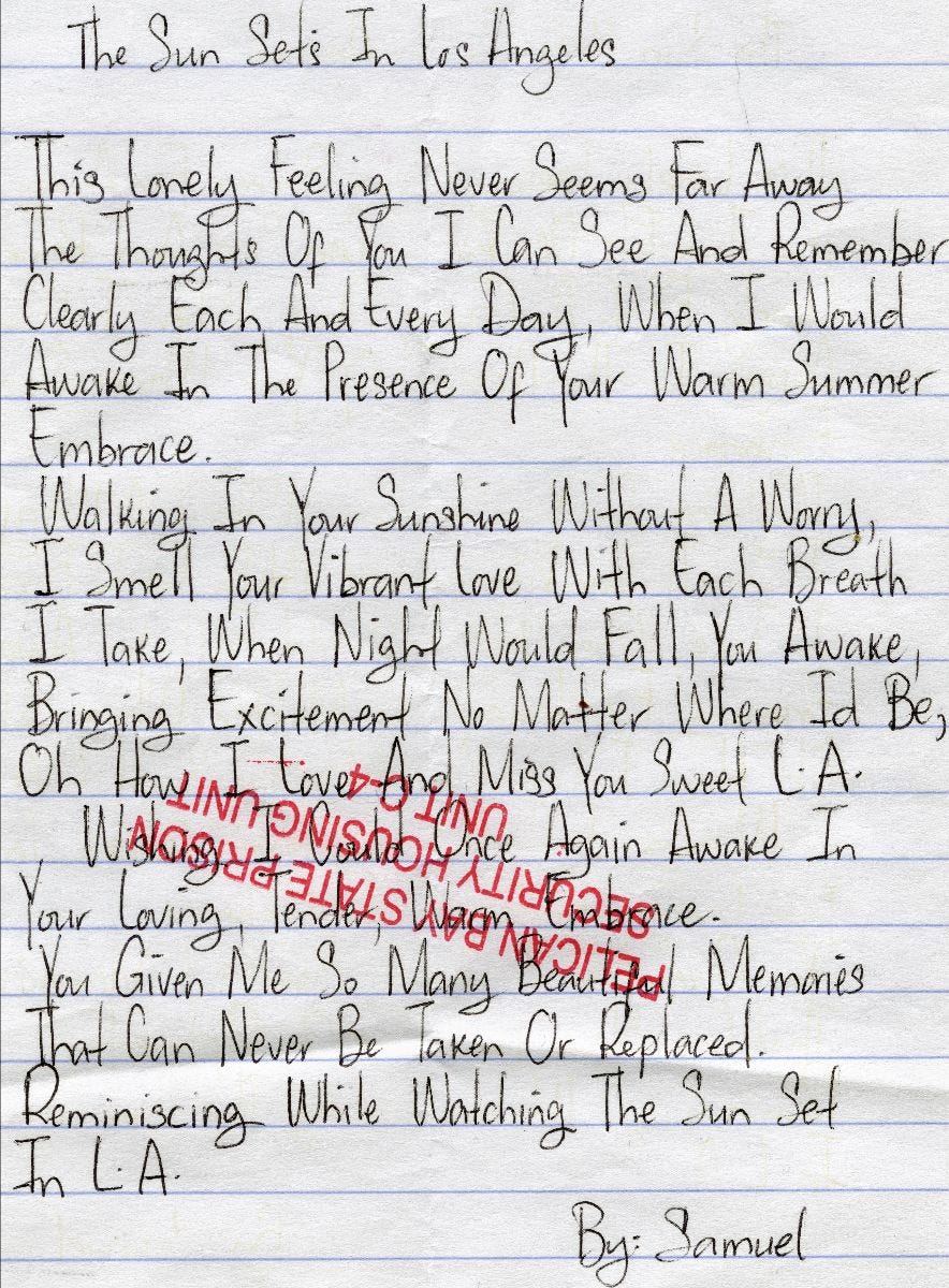 Back in the day, I used to try and write punk rock and rap songs and I started noticing that it was pretty similar to poetry. When I wound up in the SHU I started writing more. I wrote this pretty poem about a girl and showed it to a friend, and they thought it was dope. He asked me to write one for his girl, so it kinda became a thing. People would describe their loved ones and I would just write all these love poems for the guys here. But it was actually when I met you, Magida, you showed so much interest in my poetry and that kind of pushed me to keep writing.